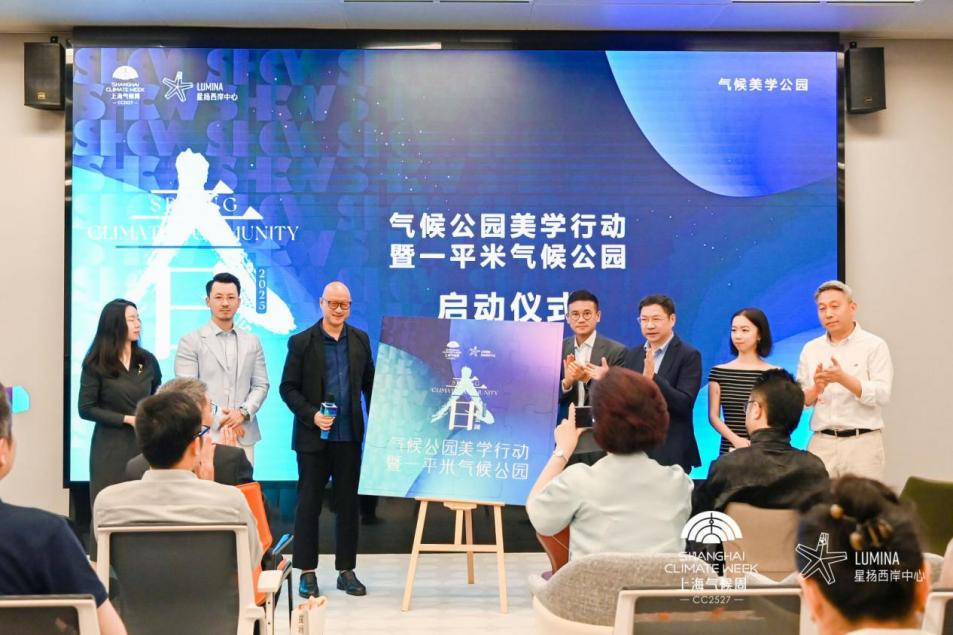 同济大学生态文明与循环经济研究所所长杜欢政、上海清华国际创新中心低碳技术所所长杨军、新华社新闻信息中心上海中心报刊部副主任邹瑞萍、东华大学服装与艺术设计学院院长孙捷、携程集团可持续发展项目总监倪佳琛、气候公园项目策展人Terence LAI与恒基(中国)投资有限公司租务总负责人(上海) 陈家俊先生上台共同启动了气候公园美学行动暨一平米气候公园(一平米拼图)项目。