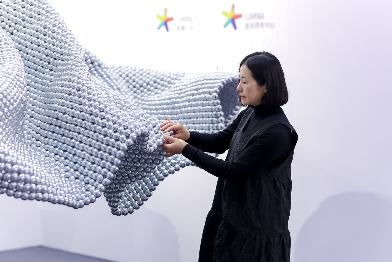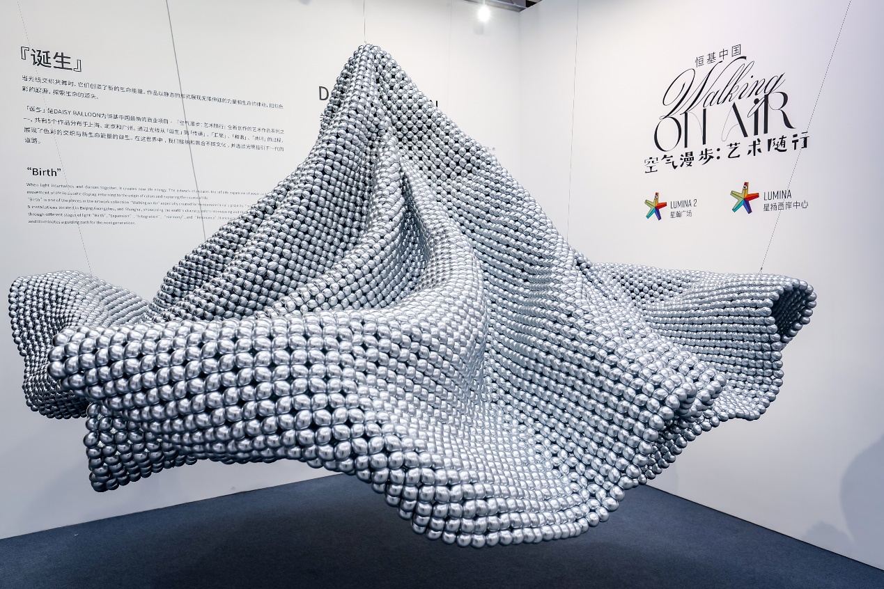 作为交易周领衔的重要项目,本届西岸艺博会上星扬西岸中心及星瀚广场参展作品「诞生」是恒基中国联手DAISY BALLOON共同推出的 "Walking On Air 空气漫步:艺术随行"艺术作品系列之一。艺术家将超过1200条长型的气球扭转、编织,制成由约10000个小圆气球构成的大型气球装置,并逐颗为气球抛光处理表面,使其从原本的灰色蜕变成金属色。定型后的作品以轻盈内核展现无限伸延的力量和生命的律动,回归色彩的起源,探索生命的源头。